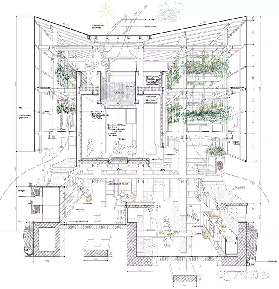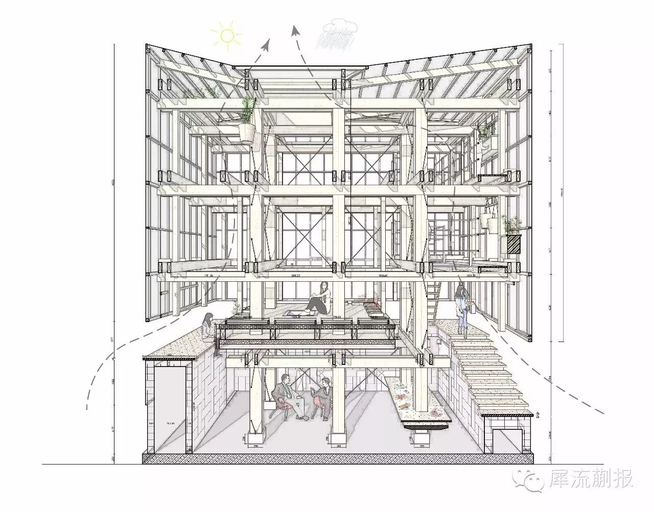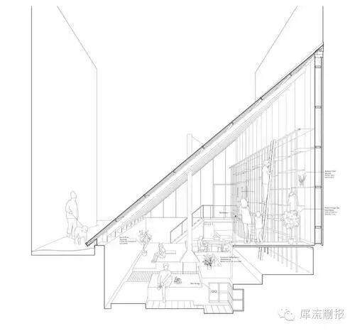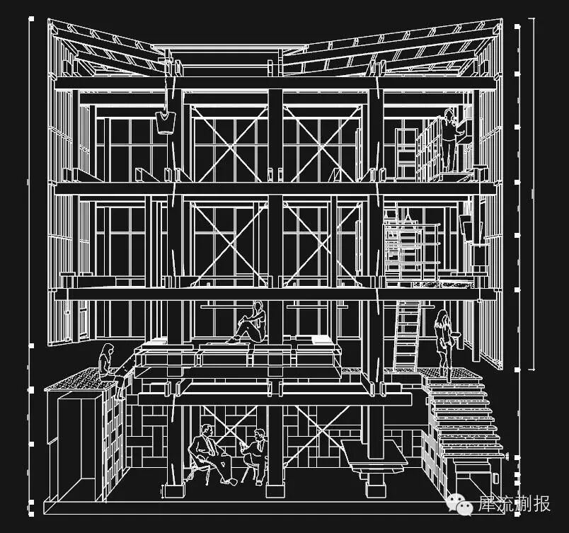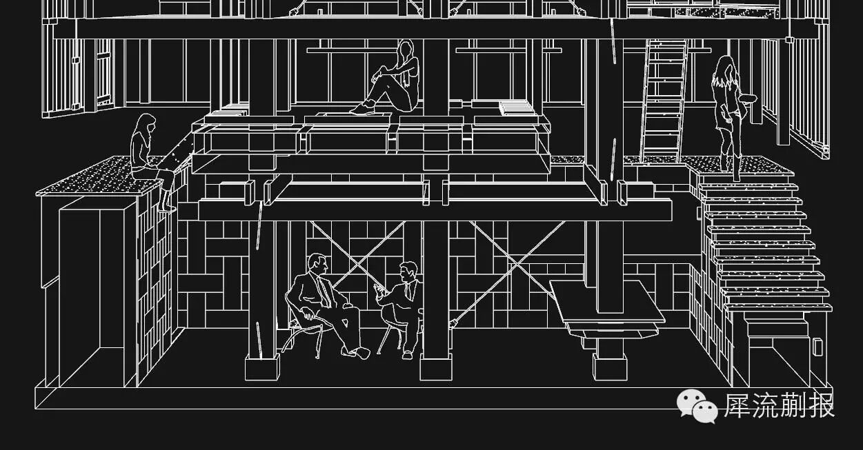 这种Section Diagram,在正确表达结构(或者更加复杂的构造)的基础上,加入人物、物品、景观,将事件和场所注入图形之中,使空间流动。表达功能的同时,描述空间和设计者的意图。