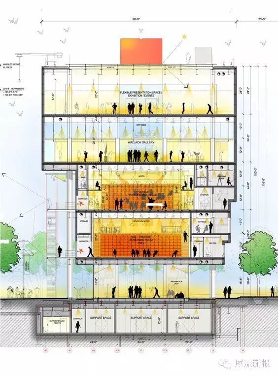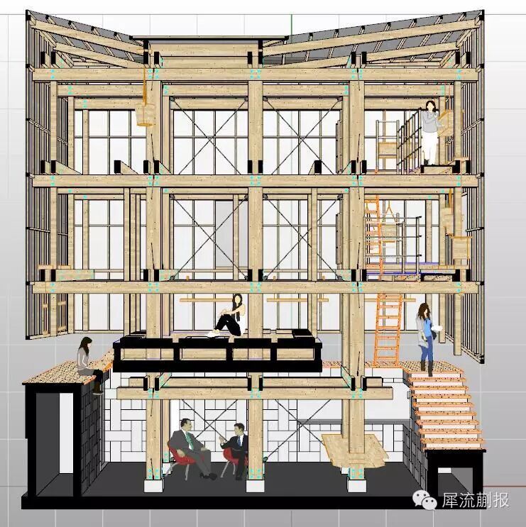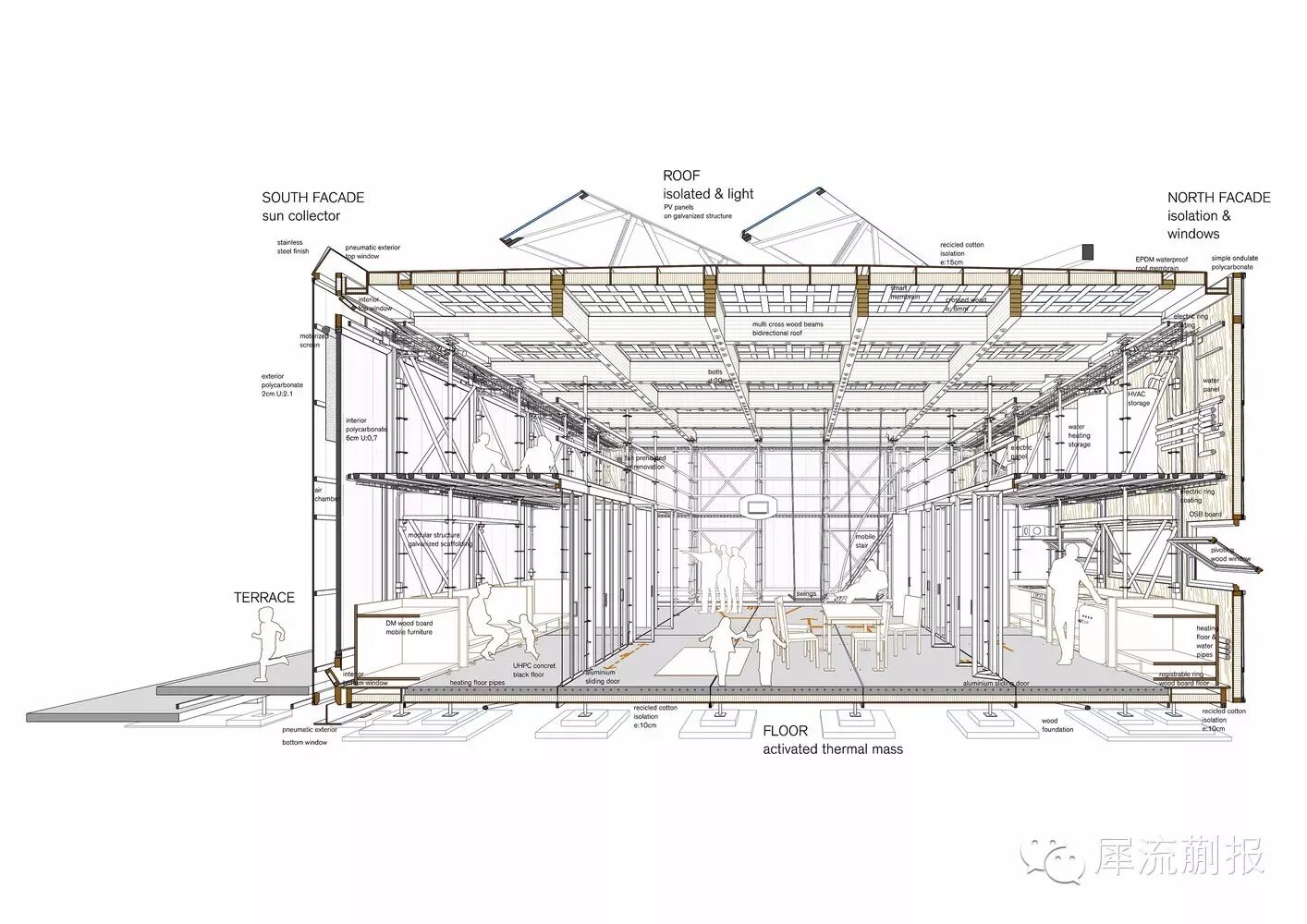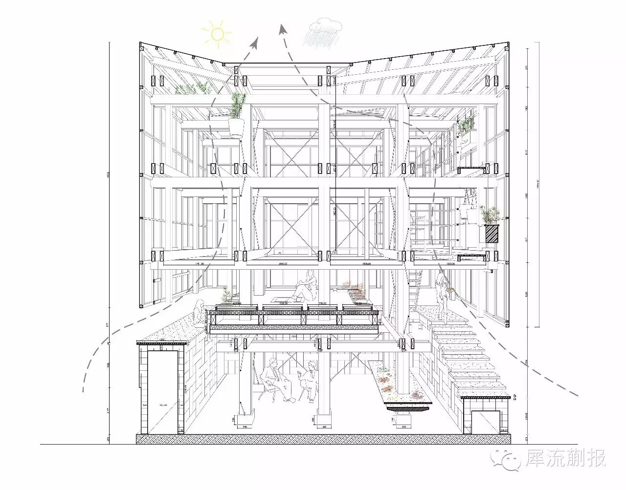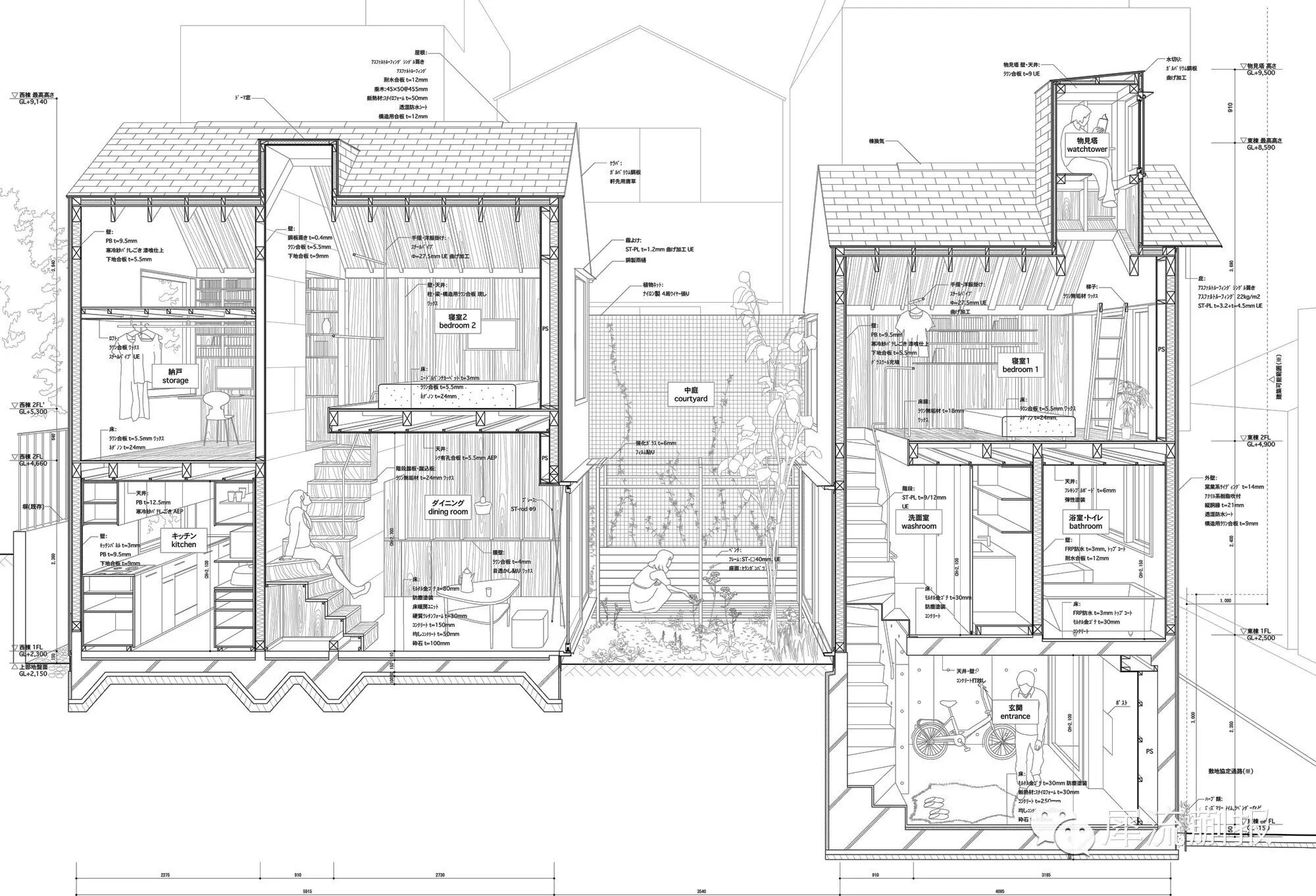 这种Section Diagram,在正确表达结构(或者更加复杂的构造)的基础上,加入人物、物品、景观,将事件和场所注入图形之中,使空间流动。表达功能的同时,描述空间和设计者的意图。
