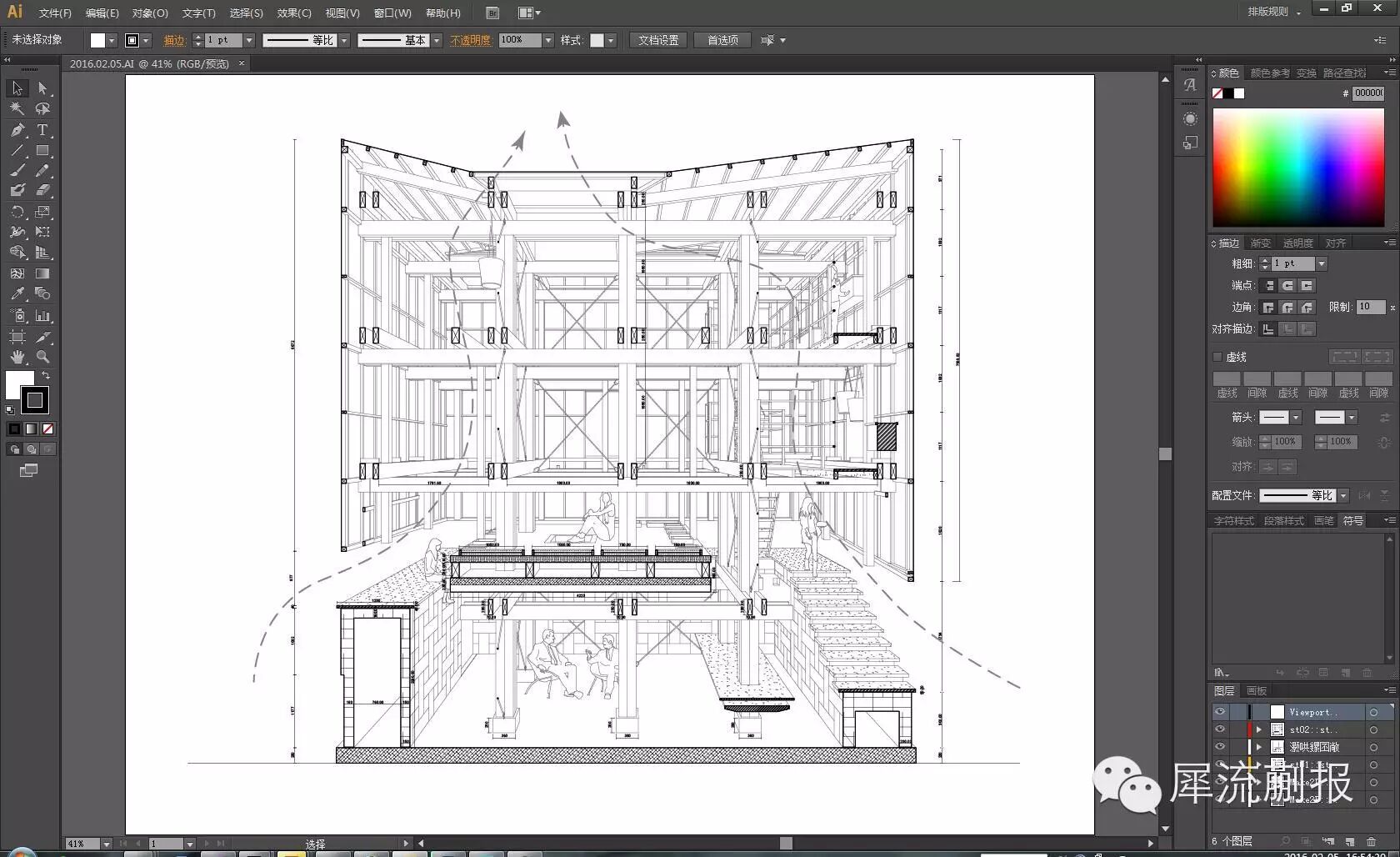最后,当图面差不多之后,就是去ai或者ps进行加工了,调调线型,多点对比,加加花花草草~~比如我们可以直接选中线稿导出成ai,是的rhino可以直接导出ai,然后调整线宽,设置线型,获得想要的样子。