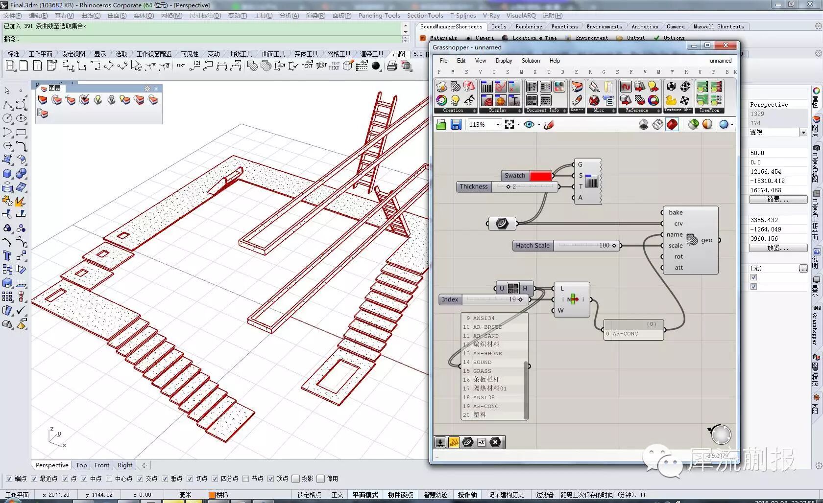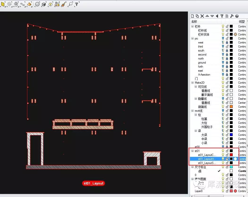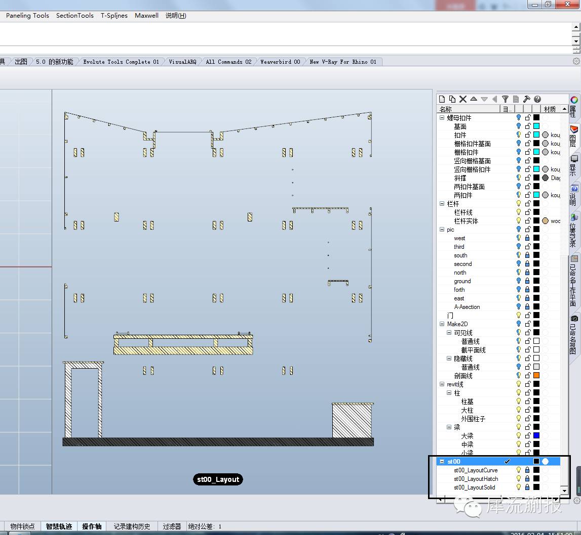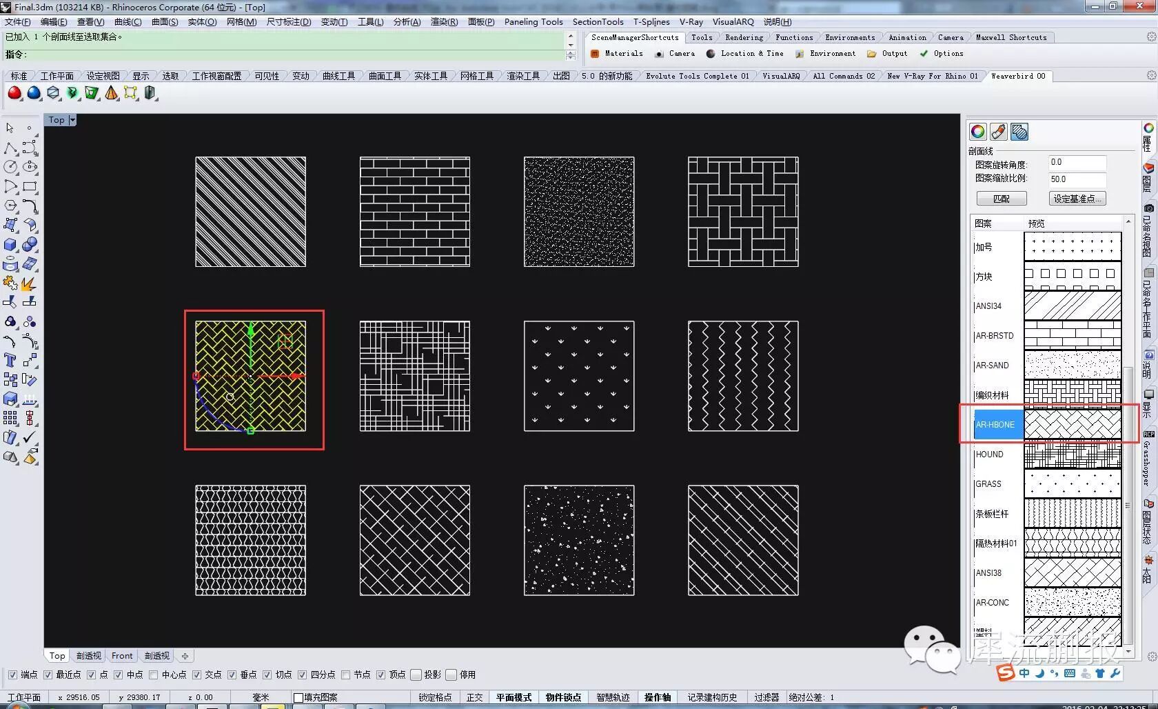 导入rhino当中,所有的填充图案就都有了,这些记得单独存个图层不要删,因为rhino的图案在关闭rhino之后就会清空,下次用还得重新导入,除非你rhino当中有对应的图案实例存在,所以存着表删~~~接下来就可以开始了。