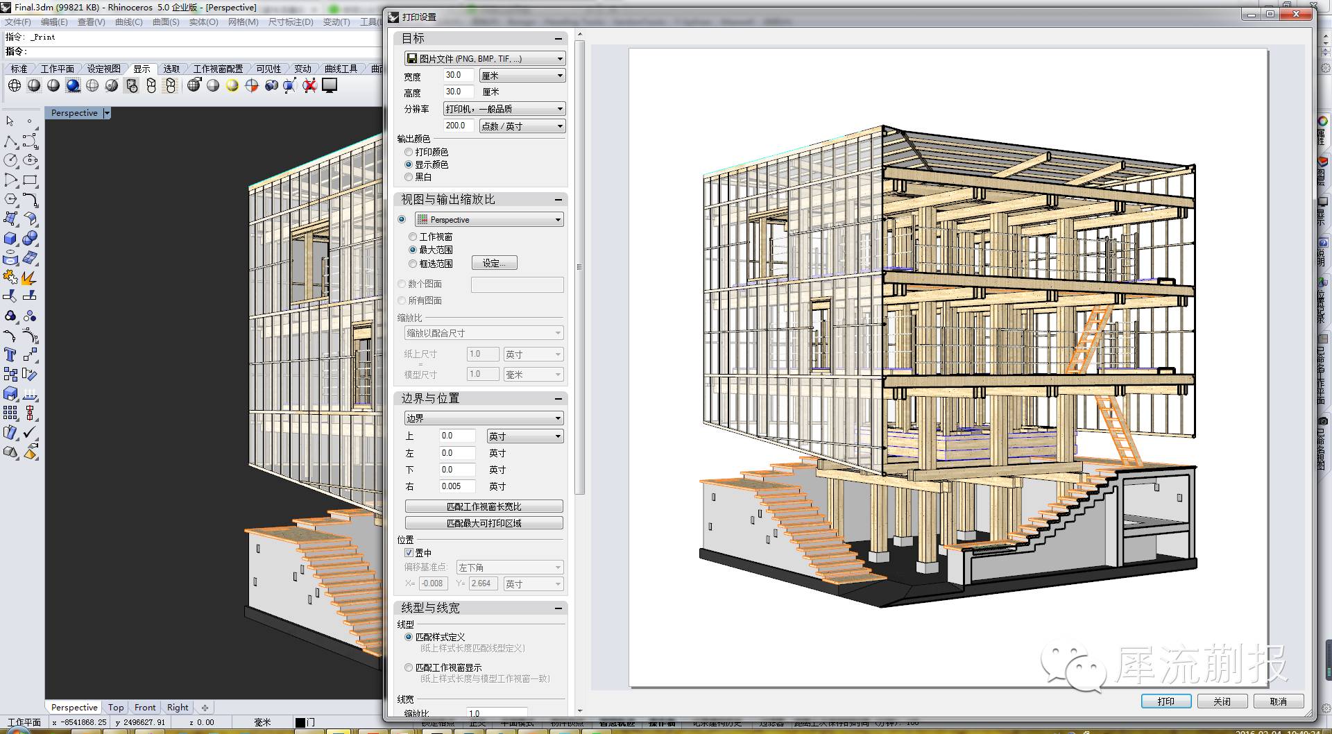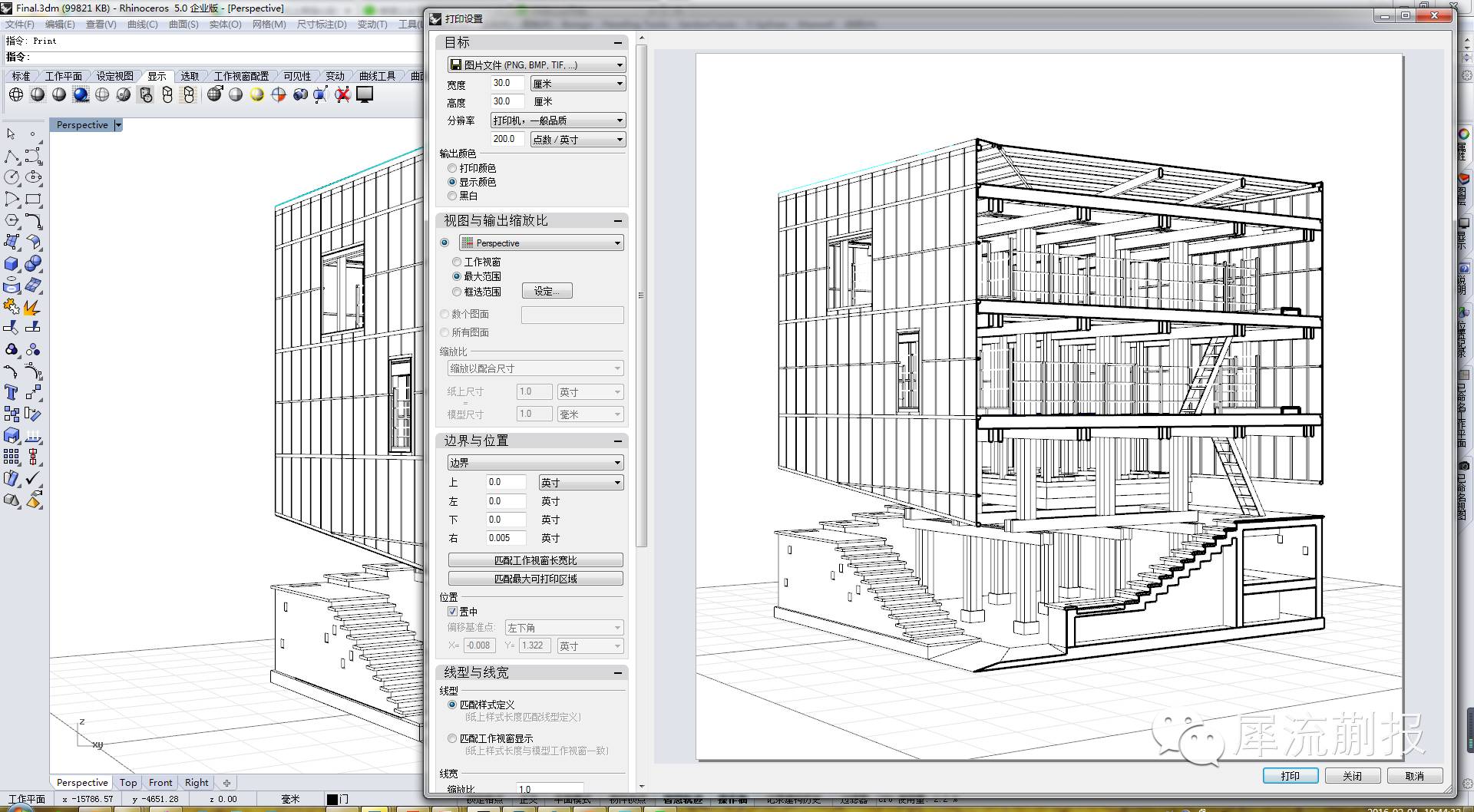 但是这样的方式缺点自然也很明显,比如本身是位图,导出之后不大好加工,剖切面还得自己一个一个的填色,也没办法去添加构造级别的线稿,有的剖切线竟然还打印不出来,实在是太低效了,可加工程度也低,不符合我们学rhino的宗旨,不过如果你仅仅是想叠线稿的话,这到不失为一个好的方法。