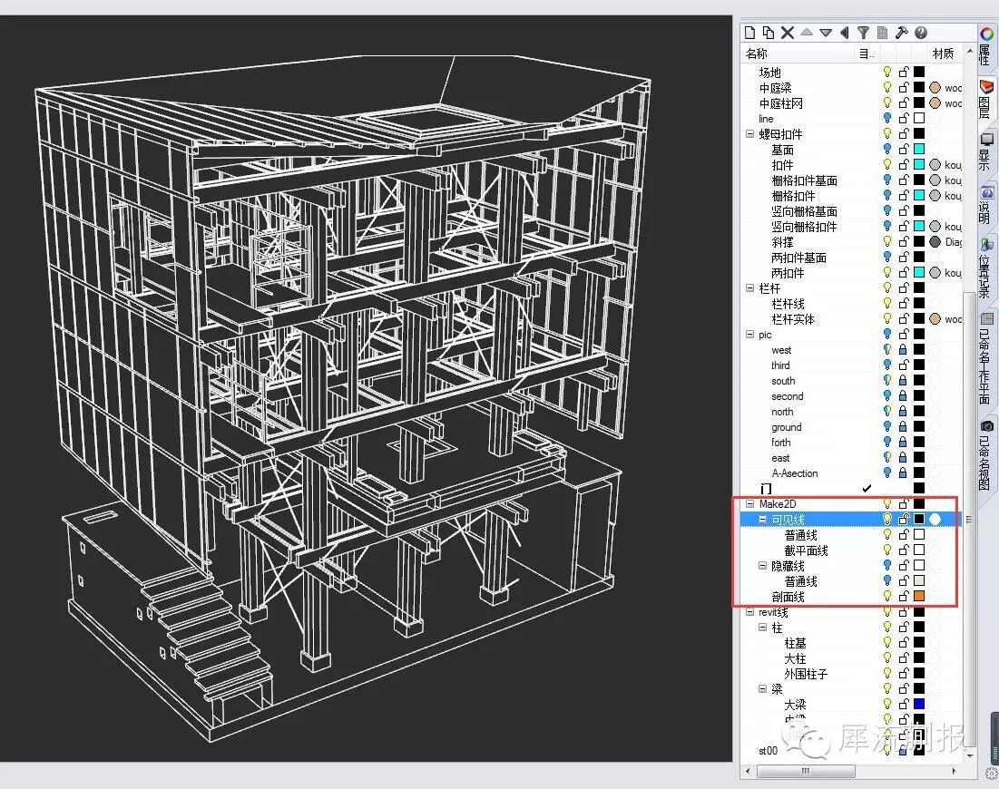 差不多是酱紫,注意,不断有截面线,还有剖面线,还封了面,并且这些面的材质都继承了剖切物体的材质哦!仔细观察你会发现多了几个图层,分别存储剖切的线和面和剖切线,并且图层是锁定的,意思是不到最后你不要去动它,因为当你修改剖切位置或者模型之后,这个剖切面是可以自动更新的!然而问题是没有看线啊,光有这个有球用?那让我们继续。