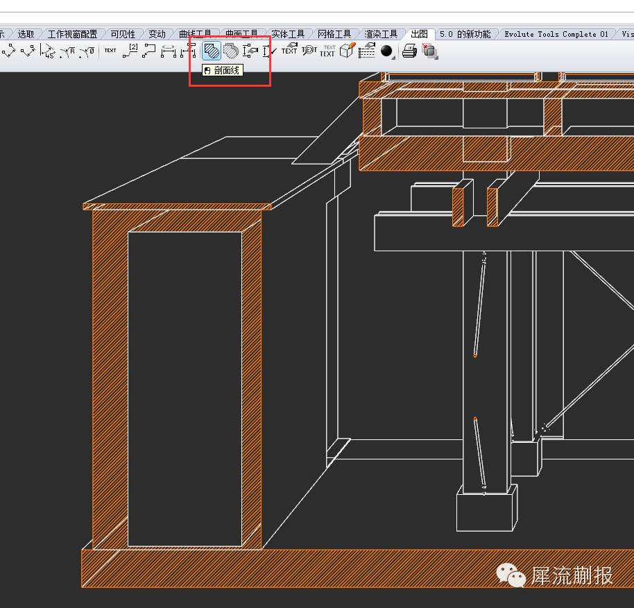 等等,好像少了什么?对!剖面线~!截面位置的剖面线我们是可以自己绘制的,像酱紫,用剖面线命令,该怎么花就怎么画,和cad差不多