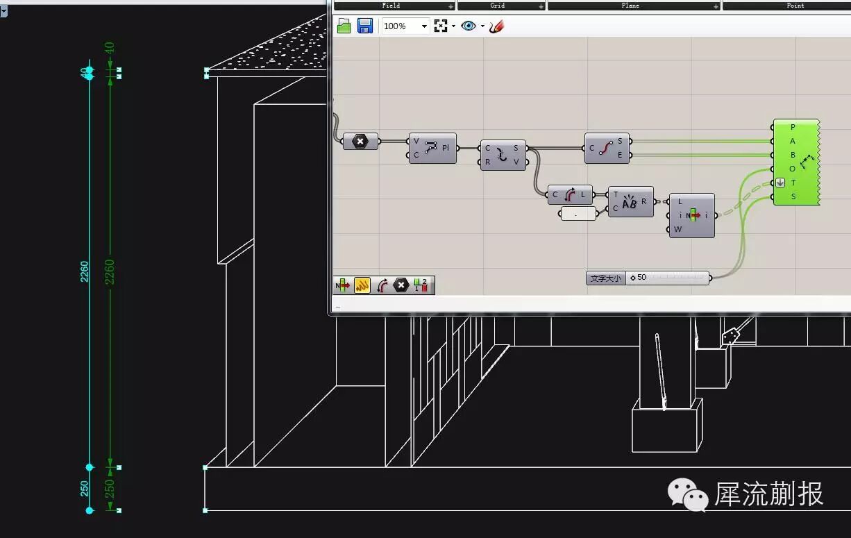 好,缩放之后就可以开始标注了,wait!突然发现rhino没有天正的多点标注啊,怎么办,一个个标注然后移动对齐么?怎么能这么低效!不符合我们rhino的大方针!怎么办?我们有GH啊!只要把关键点对齐y轴之后输入给gh自动对齐标注就哦了,bake出来的标注就是当前标注样式~~