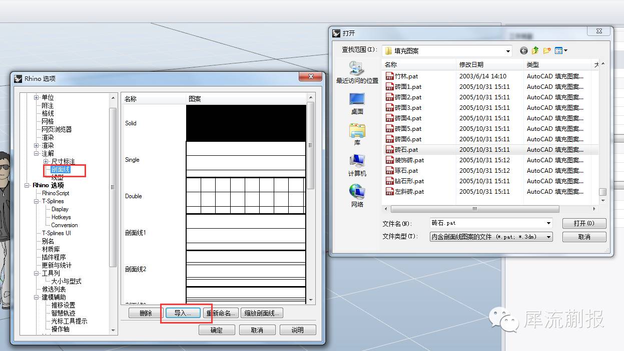 没什么办法,三维画,然后make2d呗,但是有一些是需要注意的。首先rhino自己的填充图案很少,只有几种,好在我们是可以直接从cad的图案里倒入的,cad有多少我们就有多少~!进剖面线倒入,然而这个方式有点问题,那就是每次只能倒入一个······这不坑爹么···难道我们真要一个一个的导入么?当然不是!