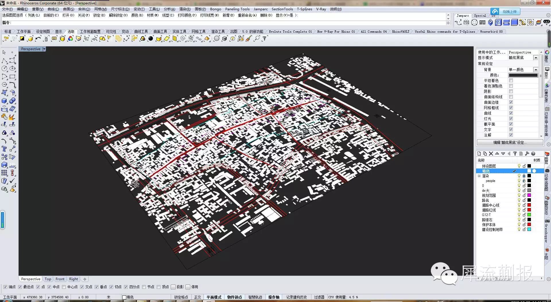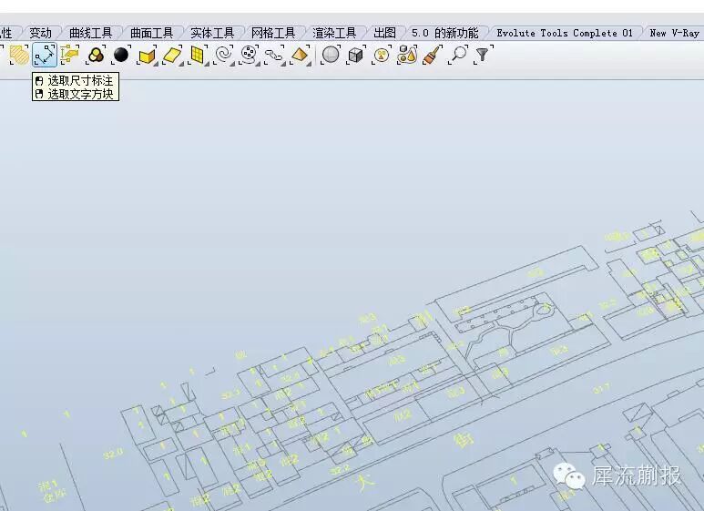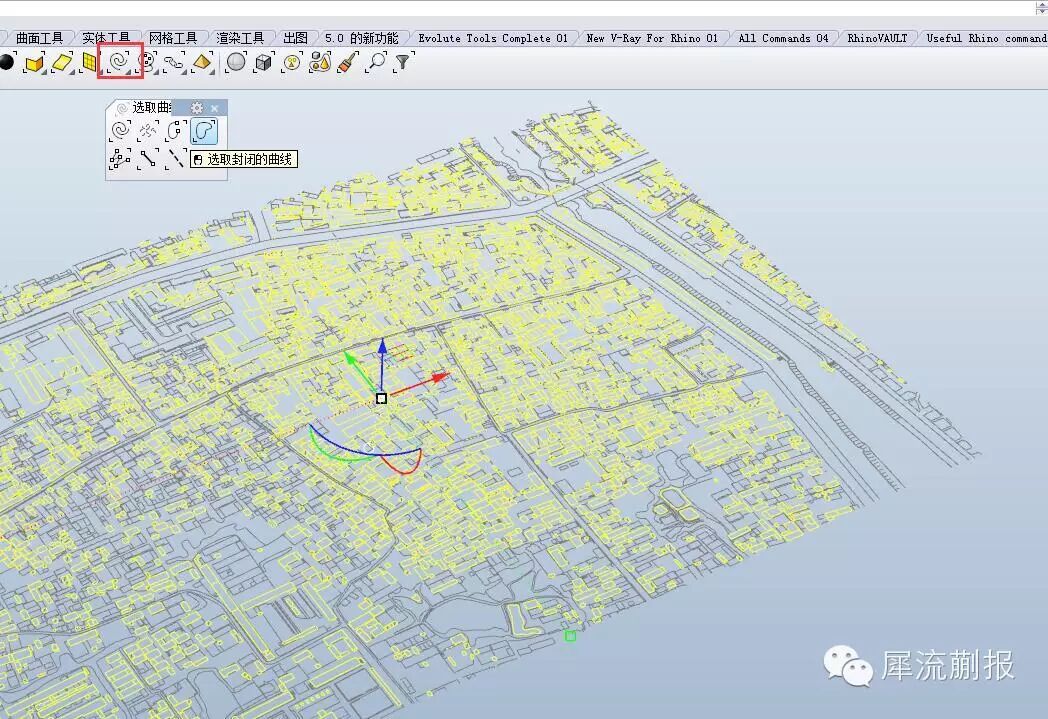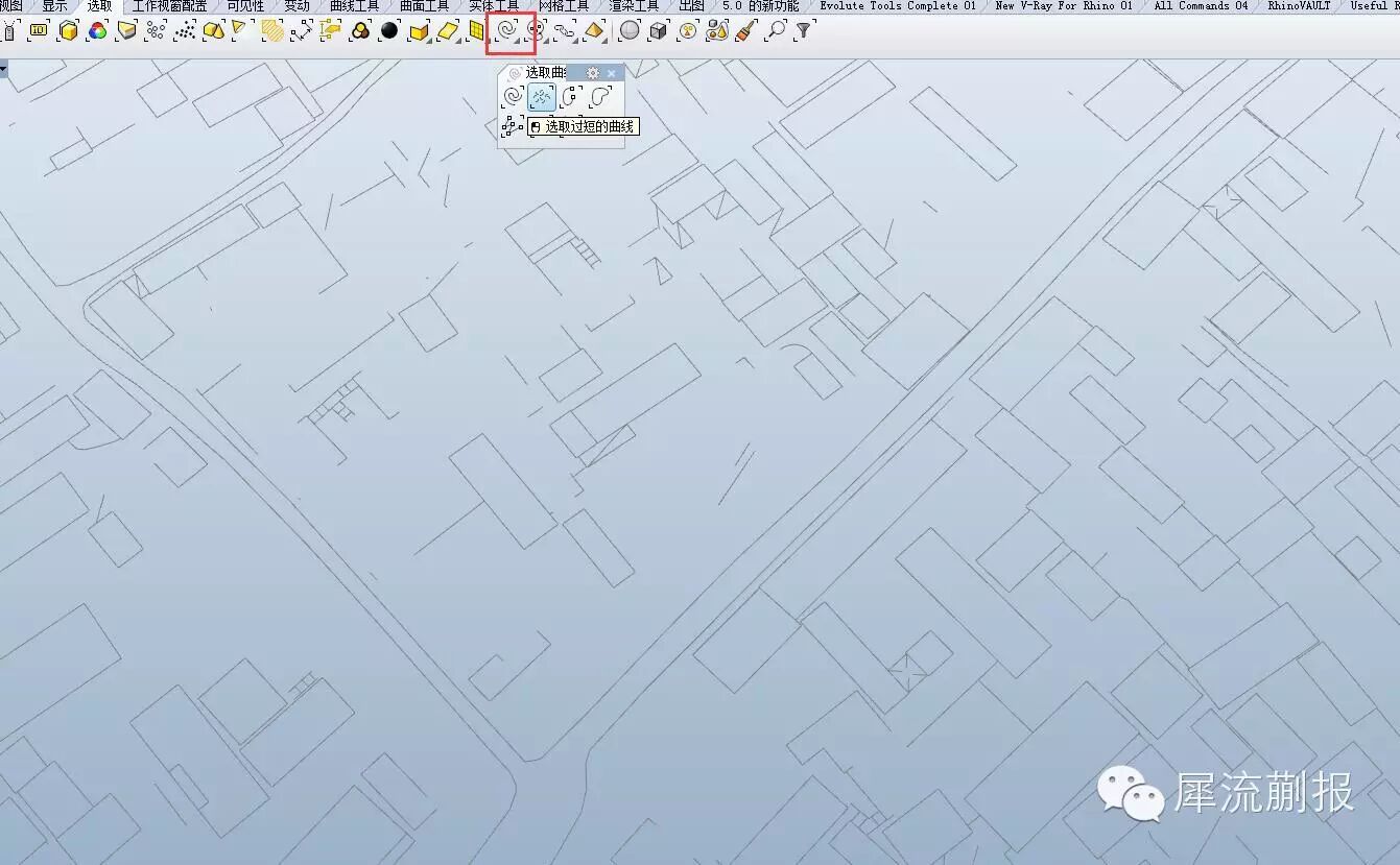 我们看个局部,这些线有的长是街道,有的短是杂线,有的看起来封闭但是实际没封闭(因为我们刚才没选中)的线框,而这些线框才是我们需要填色的东西,怎么办?怎么选择出来?rhino好像木有这样的命令啊,有的好像就只有选择一定长度以下的线·····咱们有gh嘛~~~