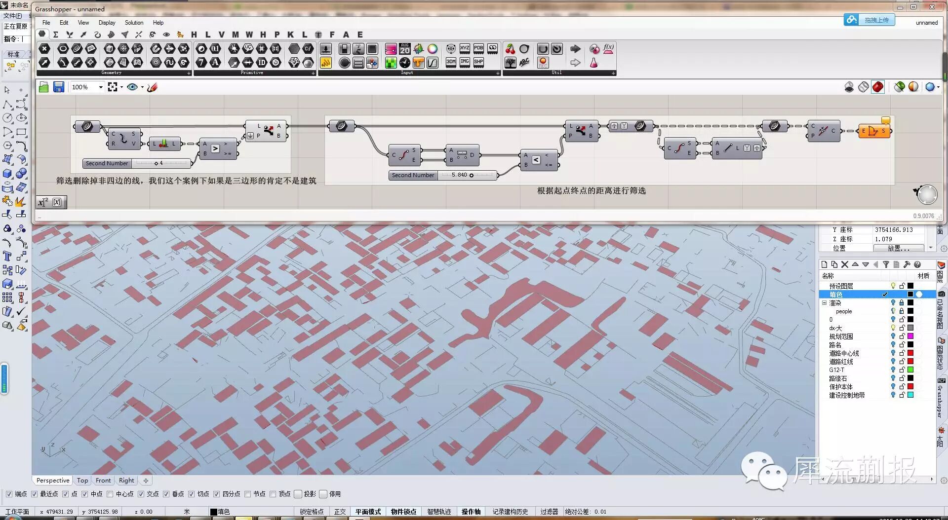 现在的线虽然有长有短,但是我们想要的建筑线框的特点却很明显那就是———这些线框的起点和终点靠的非常近!那就简单了,我们根据这一点来编个gh,首先删除边数四边以下的,本案中三边形肯定不是建筑轮廓,然后根据起点与终点的距离来筛选建筑轮廓,这样基本结果就差不多了。