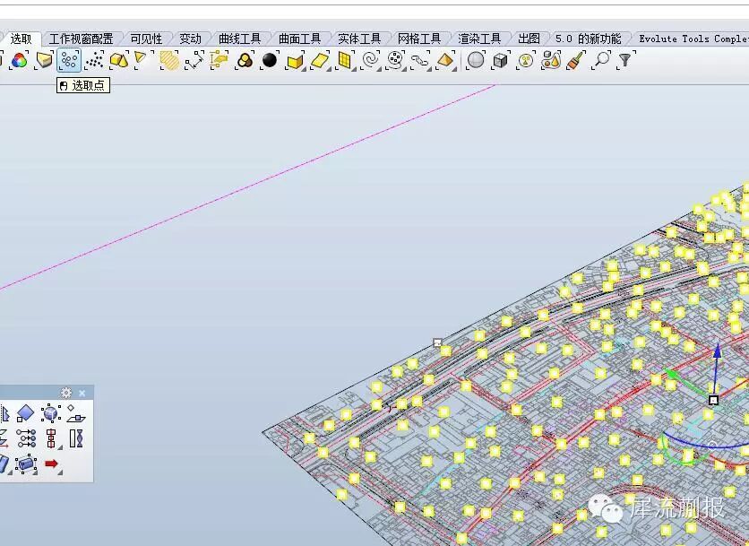 由于rhino当中点是按照视图比例大小显示的所以看起来比较大,我们直接全选点删除就哦了,反正这里我们不需要~~这里再补充下,rhino当中,基本上,你可以选择任何你想要选择的物体,不论是曲线还是直线还是一定长度的线还是封闭的线还是开放的线还是面还是多重曲面还是文字还是标注还是上一次选择的物体还是根据颜色选择还是和ps一样套锁选择还是只选择靠在一起的物体等等等,真的是很全能的,所以还是那句话,如果你觉得rhino什么事情做得很麻烦的话,很有可能(九成九)是你不知道对应的命令而已·····